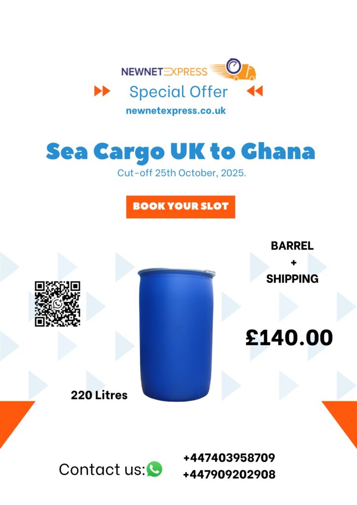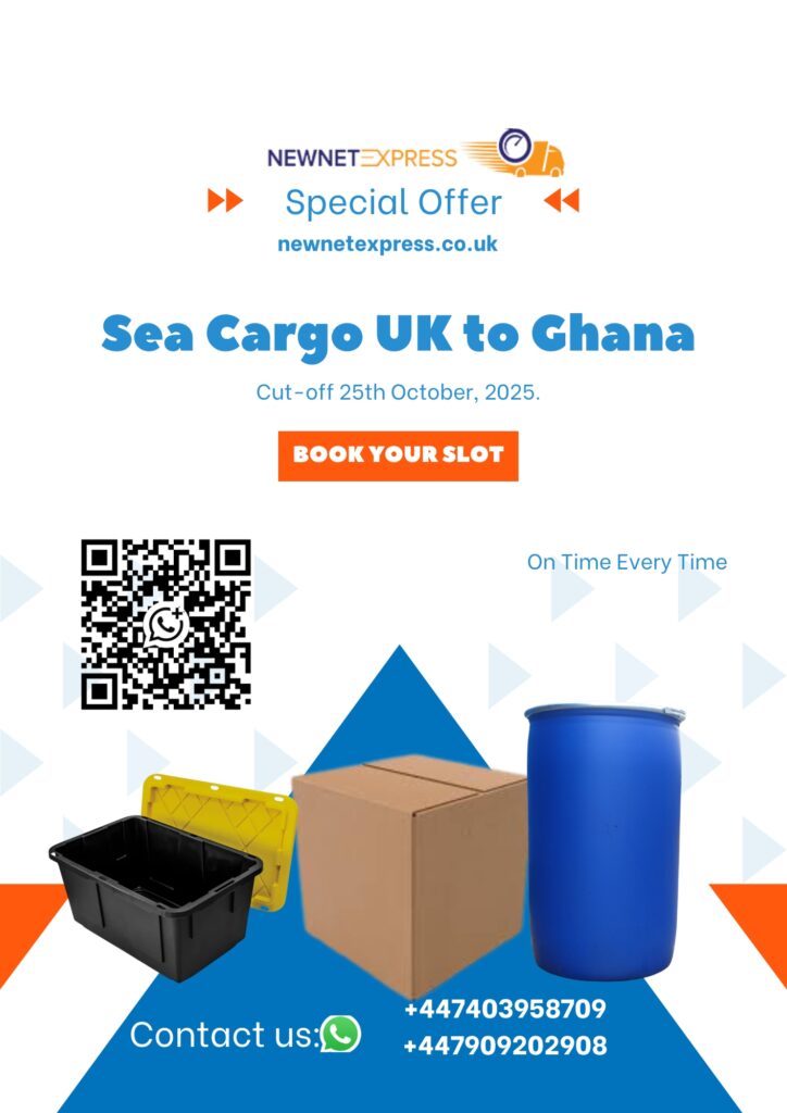 Newnet Express UK is delivering joy from 🇬🇧 to 🇬🇭 — door-to-door sea cargo arriving just in time for Christmas! Got goods heading to Ghana?